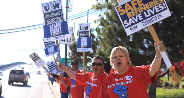 Oil producers have slashed spending because of the falling price of oil. The result has been devastating for workers on the job. According to Steelworkers International Vice-President Gary Beevers, head of the Steelworkers National Oil Bargaining Program, “This work stoppage is about onerous overtime; unsafe staffing levels; dangerous conditions the industry continues to ignore; the daily occurrences of fires, emissions, leaks and explosions that threaten local communities without the industry doing much about it; the industry’s refusal to make opportunities for workers in the trade crafts; the flagrant contracting out that impacts health and safety on the job; and the erosion of our workplace, where qualified and experienced union workers are replaced by contractors when they leave or retire,” Beevers added.