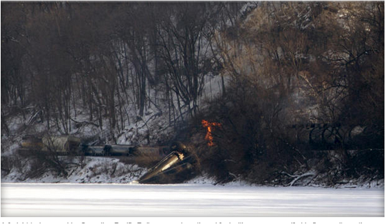 A freight train owned by Canadian Pacific Railway carrying ethanol fuel with one car engulfed in flames sits on the banks of the Mississippi River in a remote location north of Dubuque, Iowa, Feb. 4, 2015, in this picture provided by the Dubuque Telegraph Herald. MIKE BURLEY/DUBUQUE TELEGRAPH HERALD/HANDOUT VIA REUTERS