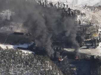 Derailed oil tanker train cars burn near Mount Carbon, W.Va., Monday, Feb. 16, 2015. A CSX train carrying more than 100 tankers of crude oil derailed in a snowstorm, sending a fireball into the sky and threatening the water supply of nearby residents, authorities and residents said Tuesday. (AP Photo/The Daily Mail, Marcus Constantino)