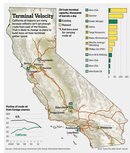 Crude-oil rail shipments have risen dramatically in the last few years. Those transports, many carrying an unusually flammable crude from North Dakota, have been involved in several spectacular explosions, including one that killed 47 residents of a Canadian town last year. Federal officials and cities along rail lines have been pushing for safety improvements. California officials have joined those efforts, saying they are concerned by estimates that six or more 100-car oil trains will soon be rolling through the state daily on the way to coastal refineries.